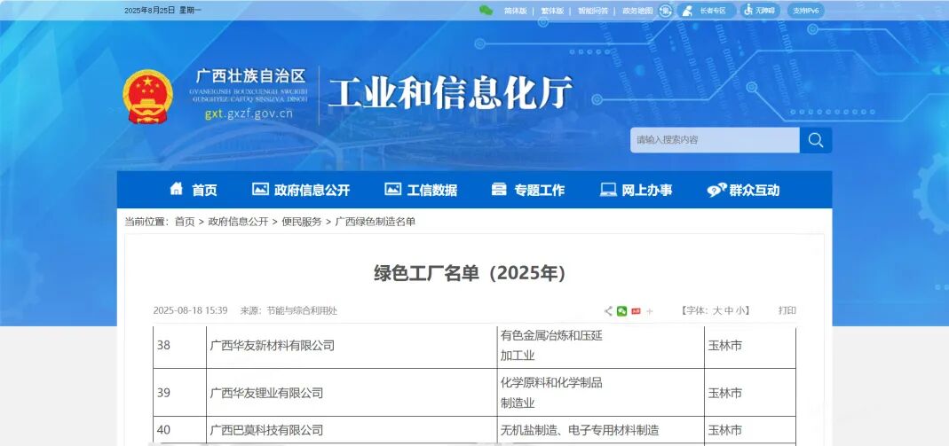 近日,廣西壯族自治區工業和信息化廳公布2025年度廣西綠色制造名單,華友廣西園區三家企業——廣西華友新材料有限公司、廣西華友鋰業有限公司、廣西巴莫科技有限公司同時入選綠色制造工廠,彰顯了華友在綠色制造領域的卓越成就和堅定承諾。