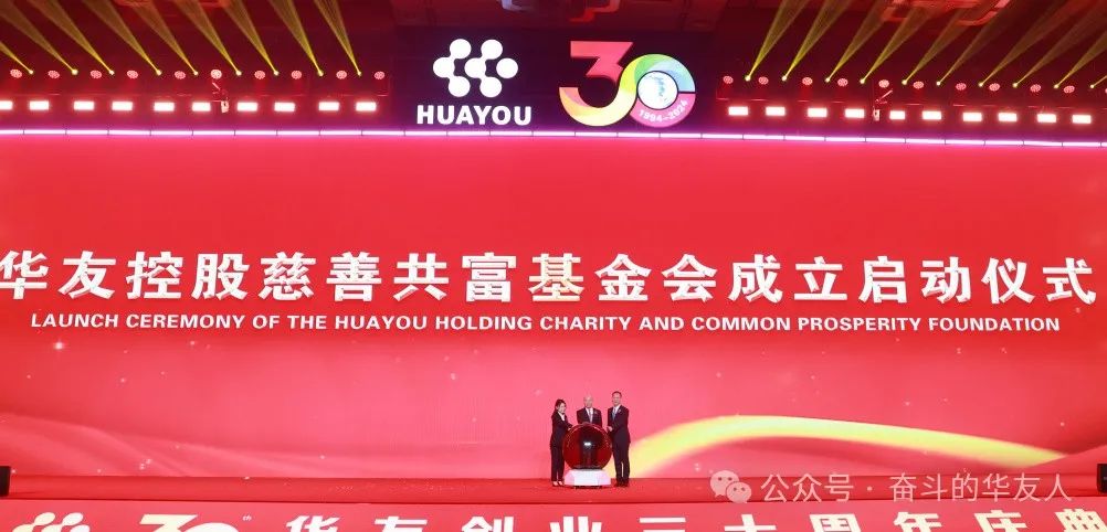 慶典最后,華友控股慈善共富基金會的正式啟動。華友控股董事長陳雪華,副董事長陳曉琳,總裁陳紅良,共同上臺,共觸希望之光,按下啟動球,標志著愛與責任的傳遞。