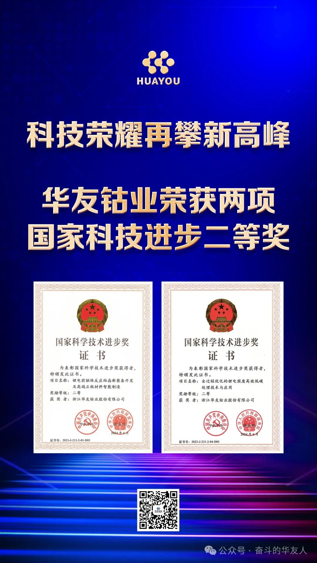 6月24日,2023年度國家科技獎勵獲獎情況揭曉,中國科學(xué)院過程工程研究所主導(dǎo)、華友參與的2項科研成果——“鋰電前驅(qū)體反應(yīng)結(jié)晶新裝備開發(fā)及高端正極材料智能制造”、“全過程優(yōu)化的鋰電固廢高效低碳處理技術(shù)與應(yīng)用”榮獲2023年度國家科學(xué)技術(shù)進步二等獎,標(biāo)志著華友在有色金屬綠色精煉、鋰電材料開發(fā)、資源循環(huán)再生利用領(lǐng)域創(chuàng)新成果再攀新高峰,彰顯了華友在新能源材料技術(shù)革新與可持續(xù)發(fā)展方面的領(lǐng)先地位。