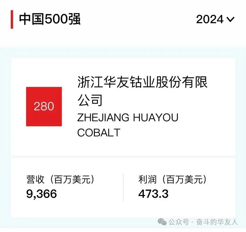 《財(cái)富》中國(guó)500強(qiáng),華友鈷業(yè)位居第280位!