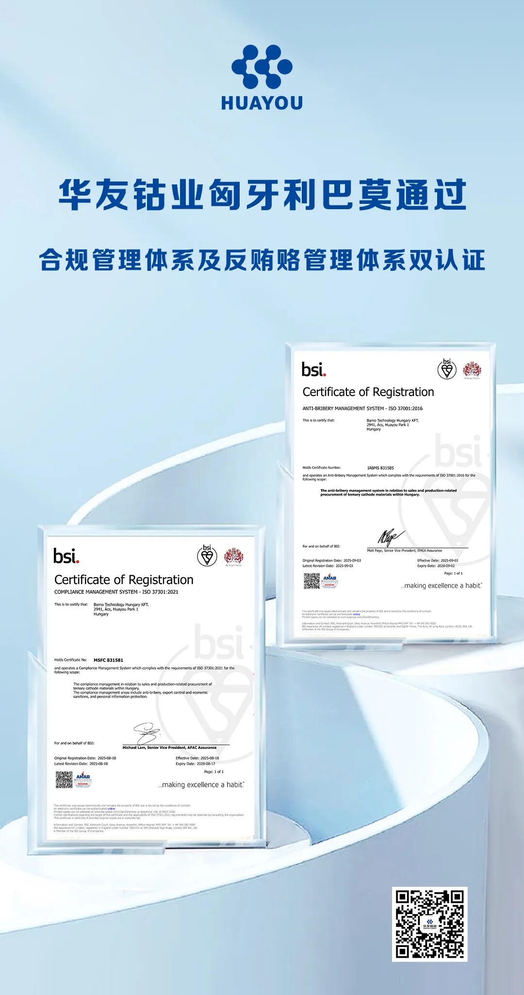 9月15日,華友鈷業旗下巴莫科技(匈牙利)有限公司(以下簡稱“匈牙利巴莫”)合規管理體系及反賄賂管理體系認證頒證儀式舉行,標志著匈牙利巴莫成為匈牙利首家通過ISO 37301合規管理體系及ISO 37001反賄賂管理體系雙認證的中資企業,彰顯了華友在新能源鋰電材料領域的合規管理領先地位。