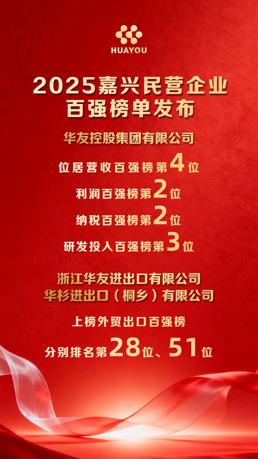 近日,2025嘉興市民營企業營收100強、利潤100強、研發投入100強、納稅100強、外貿出口100強等5張榜單出爐。華友控股集團位居嘉興市民營企業營收100強第四位。