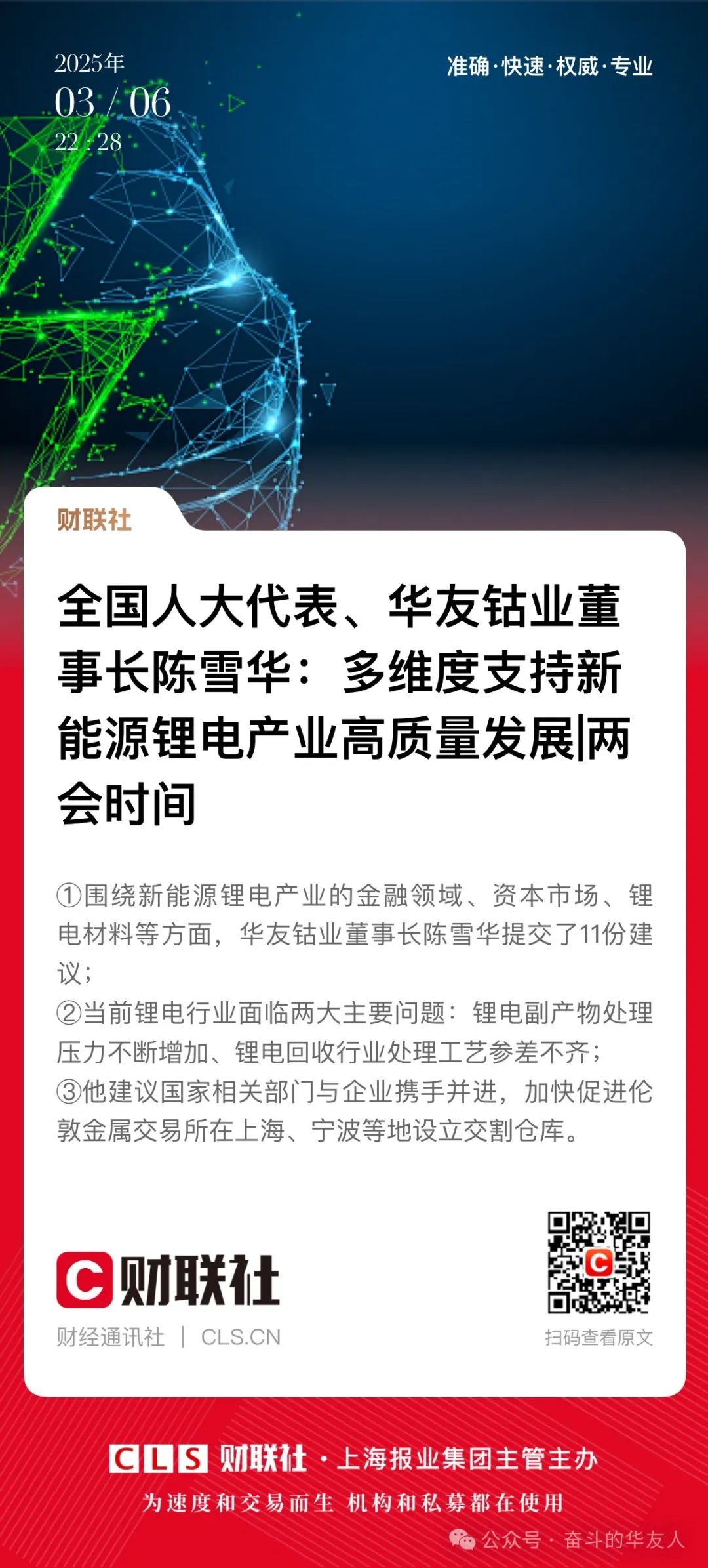 全國“兩會”期間,全國人大代表、華友鈷業董事長陳雪華聚焦民營企業、新能源鋰電產業積極建言獻策,他的建議受到《浙江衛視新聞聯播》、《上海證券報》、《證券時報網》、《財聯社》、《桐鄉發布》等主流媒體廣泛關注。
